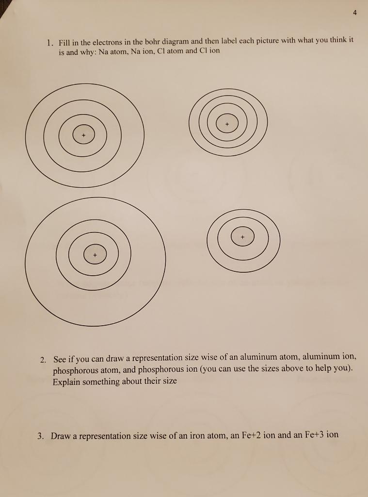 Use the table above to draw the Bohr model diagram for the following atoms and ions. Argon atom 22N Chlorine atom Chlorine ion 19 Potassium atom Potassium ion 3. What do you notice about the arrangement of electrons in the Bohr model of a neon atom, fluorine ion, and a magnesium ion? ALI e ec Levels 4. What would you expect to see with the arrangement of electrons in the Bohr model of an …
