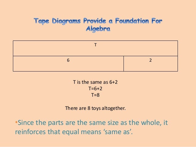 A tape diagram is a rectangular visual model resembling a piece of tape, that is used to assist with the calculation of ratios.It is also known as a divided bar model, fraction strip, length model or strip diagram. [citation needed] In mathematics education, it is used to solve word problems.Example. If, for example, a boy has won fifteen games, and the ratio of his wins to losses is 3:2, a ... A tape diagram is a rectangular drawing that appears like a tape piece with divisions to support mathematical calculations. It is a graphic tool used commonly in solving ratio-based mathematical word problems. Tape diagrams are visual representations that represent the sections of a ratio by using rectangles. As they are a visual model it takes ... Tape Diagram Worksheet 1 - You will use logic and reasoning (or tape diagrams) to solve real world problems. By using clues to identify a variable and set up a tape diagram, you will be able to quickly solve each problem. Tape Diagram Worksheet 1 RTF Tape Diagram Worksheet 1 PDF View Answers