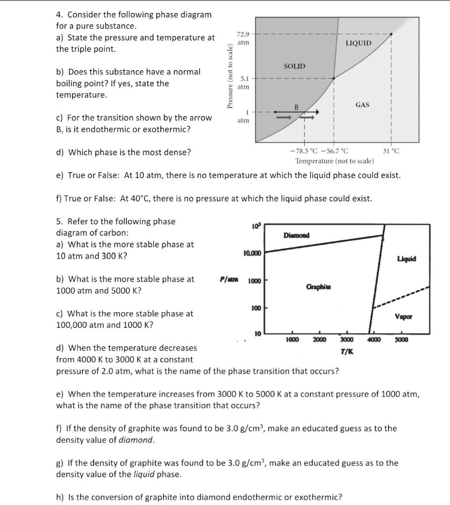 Consider the phase diagram shown. choose the statement below that is true.. Consider the phase diagram shown Choose the statement below that is TRUE LIQUID SO 1 GAS 78.5 %€ 56.7 "€ J"C Tatnpcruture (not jle) 0 The line ...4 answers · Top answer: a here is false. Ah, because that occurs at approximately 265 Kelvin. Part B is also false ... Choose the statement below that is TRUE. A) A solution will form between two substances if the solute-solvent interactions are of comparable strength to the solute-solute and solvent-solvent interactions. ... Assign the appropriate labels to the phase diagram shown below. A) A = liquid, B = solid, C = gas, D = critical point ... Consider the ... 9) 9) Consider the phase diagram shown. Choose the statement below that is TRUE 72.9 atm LIQUID SOLID atim GAS atm -78.5â -56.7â 31â Temperature (not to scale) A) The solid phase of this substance is higher in density than the liquid phase. Consider the phase diagram shown below. Choose the statement below that is TRUE. (A) The triple point of this substance occurs at a temperature of 72.9 atm. (B) At 10 atm of pressure, there is no temperature where the liquid phase of this substance would exist.