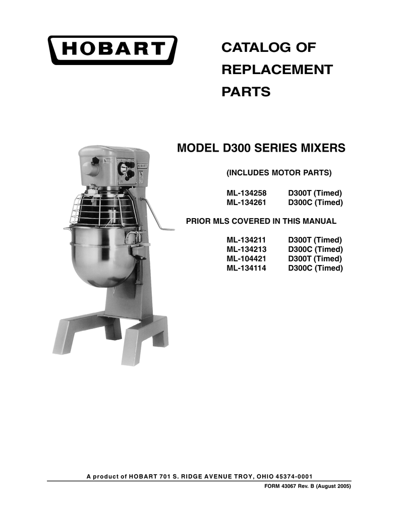 replacement parts a product of hobart corporation701 ridge avenue troy, ohio 45374-0001 model d300 series mixers (includes motor parts) ml-104420 d300 (non-timed) ml-104421 d300t (timed) ml-104422 d300d (non-timed) ml-104423 d300dt (timed)
