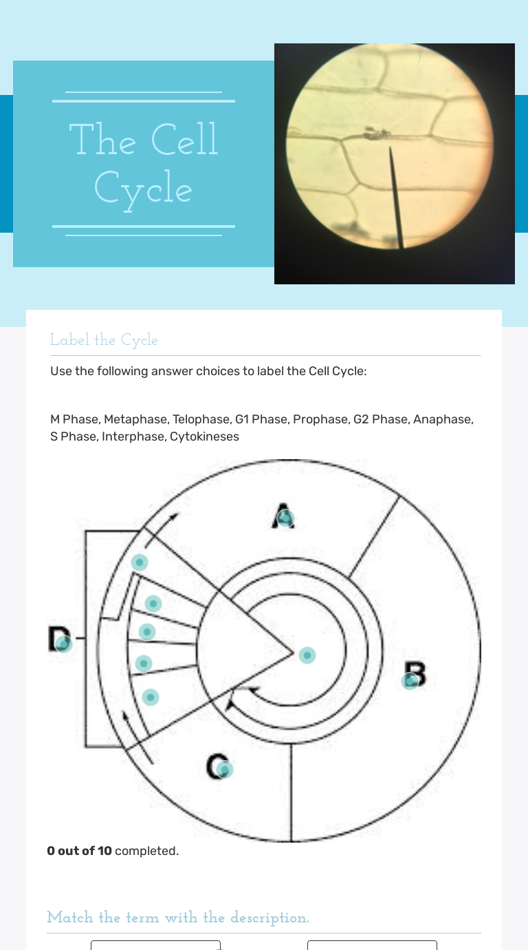Cell cycle diagram worksheet. The diagram below shows siz cells in various phases of the cell cycle. Note the cells are not arranged in the order in which the cell cycle occurs. Use the diagram to answer questions 1-7. PROPHASE 1.Cells A & F show an early and a late stage of the same phase of the cell cycle. What phase is it? C 2.Which cell is in metaphase? This Mitosis Cell Cycle Color Diagram Bundle contains a two 2-page documents and a teacher key. All files come in both PDF and .doc. The student worksheet has two versions. - Page one includes the Cell Cycle Diagram (Version 1 with labels,0 Version 2 is more difficult without labels) - Page two i Cell Cycle zDuring this part of the cell cycle, DNA must be replicated zUsing the materials from the supply bag, make exact copies of each of your DNA strands. Even the damaged chromosome should be copied exactly. zPlace the centromere regions of the chromatids on top of each other . Turn your wheel to the next checkpoint . zYou have a mutation in the gene that produces the ATM/Nibrin protein ... The-cell-cycle-worksheet with answers Lecture Material the cell cycle worksheet name: matching: match the term to the description prophase interphase telophase