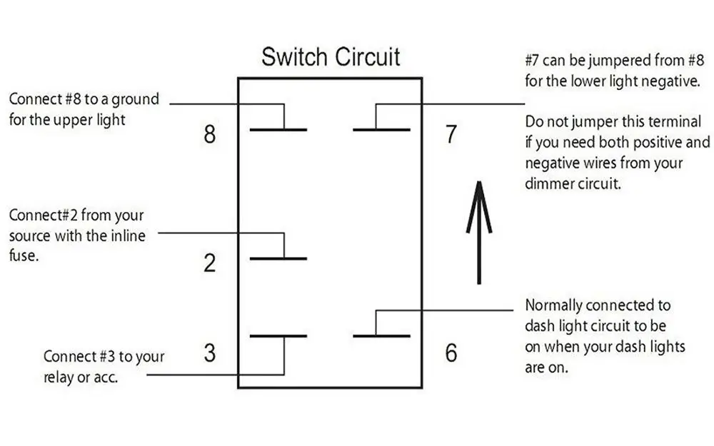 #2 - Power (+) #3 - Outgoing (To Relay, Equipment or Accessory) #8 - Top LED "ON" Light Negative (-) #7 - Lower "Dash" LED Light Negative (-) #6 - Lower "Dash" LED Light Positive (+)