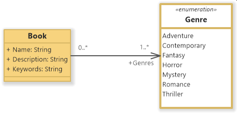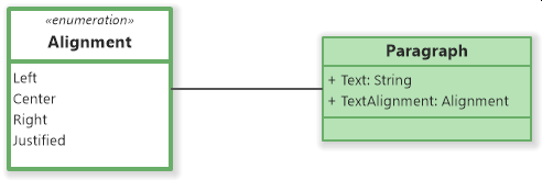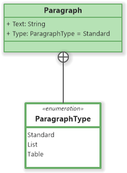 The diagram for a particular class is presented in a box, with the class name at the top in the middle, in Itlaic if the class is an abstract class otherwise written regularly. However if the class is in interface, in that case it should clearly be indicated as <<interface>>. This is then separated by a line. How do I represent a class defining an enum in a UML class diagram? 0. how to represent enums in DDD Aggregrate modeling. Related. 1079. Convert a string to an enum in C#. 3572. How can I cast int to enum? 1325. Create Generic method constraining T to an Enum. 4113. How to enumerate an enum. 940. String representation of an Enum . 2203. How to get an enum value from a string value in Java ... Stereotypes are defined with the class keyword, << and >>.. You can also define notes using note left of, note right of, note top of, note bottom of keywords.. You can also define a note on the last defined class using note left, note right, note top, note bottom.. A note can be also define alone with the note keywords, then linked to other objects using the .. symbol. This is not directly mentioned in the UML Specification but comes as a logical consequence). If the property in child redefines property from parent it usually specifies it in more details. One of obvious possible redefinitions is the change of attribute data type. In this case the change will be from broader (complete) enum to a narrower one.