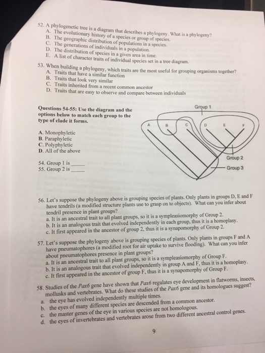 Hello Biology, I have a list of species names (~1800) verified against WoRMS (http://www.marinespecies.org/). I also have the Class, Order and Families (76) of all the species and would like to make a taxonomic phylogenetic tree. When I go to build one in something like the Interactive Tree Of Life (http://itol.embl.de/) it checks against the NCBI database (https://www.ncbi.nlm.nih.gov/) and sends back errors that about 20% of my species are not listed and that it can not make my tree. It wou... A phylogenetic tree is a diagram that describes a phylogeny. What is a phylogeny? A. The evolutionary history of a species or group of species. B. phylogeny The geographic distribution of populations in a species. C. The generations of individuals in a population. D. The distribution of species in a given area in time. E. A list of character ... PHYLIP comes with an extensive set of documentation files. These include the main documentation file (this one), which you should read fairly completely. In addition there are files for groups of programs, including ones for the molecular sequence programs, the distance matrix programs, the gene frequency and continuous characters programs, the discrete characters … A taxon which is separated from a common ancestor is called outgroup. The main difference between cladogram and phylogenetic tree is that cladogram is an evolutionary tree with branches with equal distance, showing the relationship between a group of clades whereas phylogenetic tree is an evolutionary tree showing an estimate of phylogeny where ...
