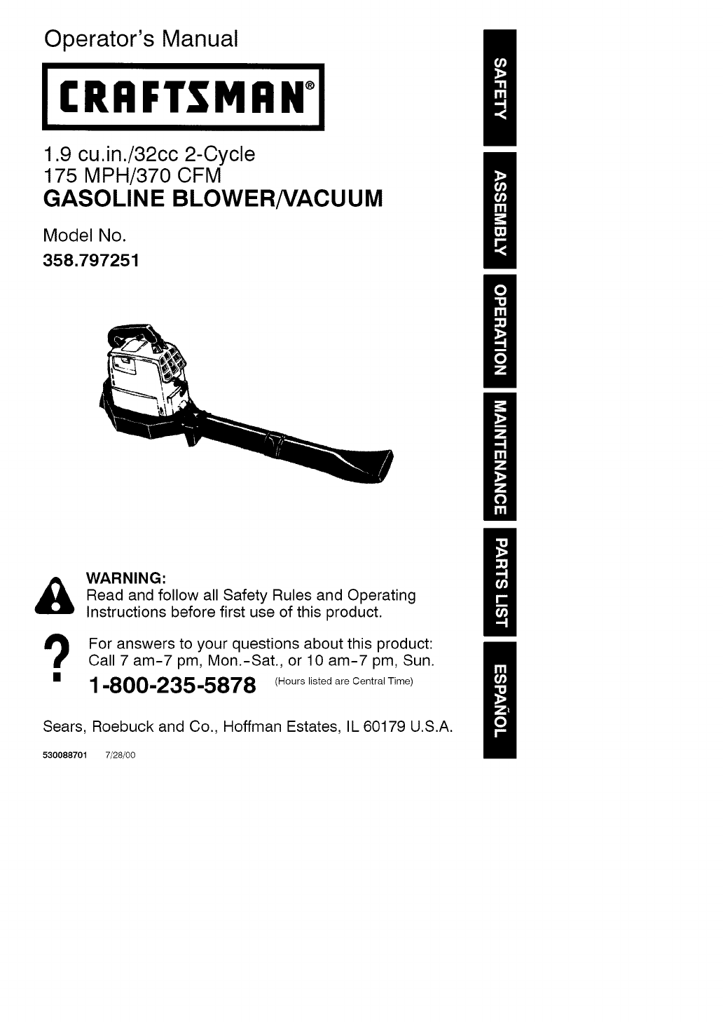 Craftsman Gas Leaf Blower...HELP PLEASE! - Lawn Mower Forum Hi, My metal detecting buddy gave me a Craftsman Gas Leaf Blower. On the side Cover: Sears Best/Craftsman Power Blower/Vac Gas Operated 32cc 360 CFM 170 MPH I can't find a serial no. or a model no. on this equipment. Is it hidden? I got no. off the carb. WT141A = Walbro Can I get a manual for this? Seems that it will not stay running after starting. It ran last year, I was to Craftsman Blower | 358797251 | eReplacementParts.com Need to fix your 358797251 Blower? Use our part lists, interactive diagrams, accessories and expert repair advice to make your repairs easy. ... Craftsman 358797251 Blower Parts. Search within model. Questions & Answers Page A. Page B. Page C. ... Fuel Line. $3.58. In Stock, 25+ available Add to Cart $3.58 Add to Cart 47 Fuel Line (25-Inch) $4 ...