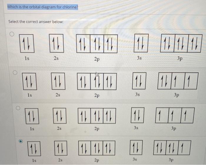 What is orbital diagram for chlorine? - Answers An orbital is a region of space that an electron can exist in. For the diagram you start with the 1 s orbital and then 2s, 2p, and so on. Each orbital can hold 2 electrons and each arrow ...