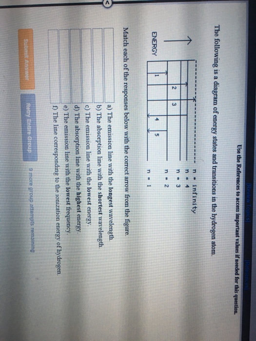 Chemistry questions and answers. The following is a diagram of energy states and transitions in the hydrogen atom. Match each arrow with the correct response below. The emission line with the longest wavelength. The absorption line with the longest wavelength. The emission line with the highest energy. The absorption line with the highest energy. Jun 05, 2019 · From the above energy diagram, you can easily identify which transition has more energy gap and requires more energy for the transition. So totally we have 4 possible electronic transitions with energy requirements for each transition in the following order. σ → σ* > n → σ* > π → π* > π→ π* Note: Transitions of σ → π* and π ... Science Chemistry Q&A Library The following is a diagram of energy states and transitions in the hydrogen atom. n = infinity 4 n = 3 3 n = 2 ENERGY 4 n = 1 Match each arrow with the correct response below. a) The emission line with the shortest wavelength. b) The absorption line with the shortest wavelength. c) The emission line with the lowest energy. Science. Chemistry. Chemistry questions and answers. The following is a diagram of energy states and transitions in the hydrogen atom. Match each of the responses below with the correct arrow from the figure. 1.) The emission line with the longest wavelength._____ 2.) The absorption line with the. Question: The following is a diagram of energy ...