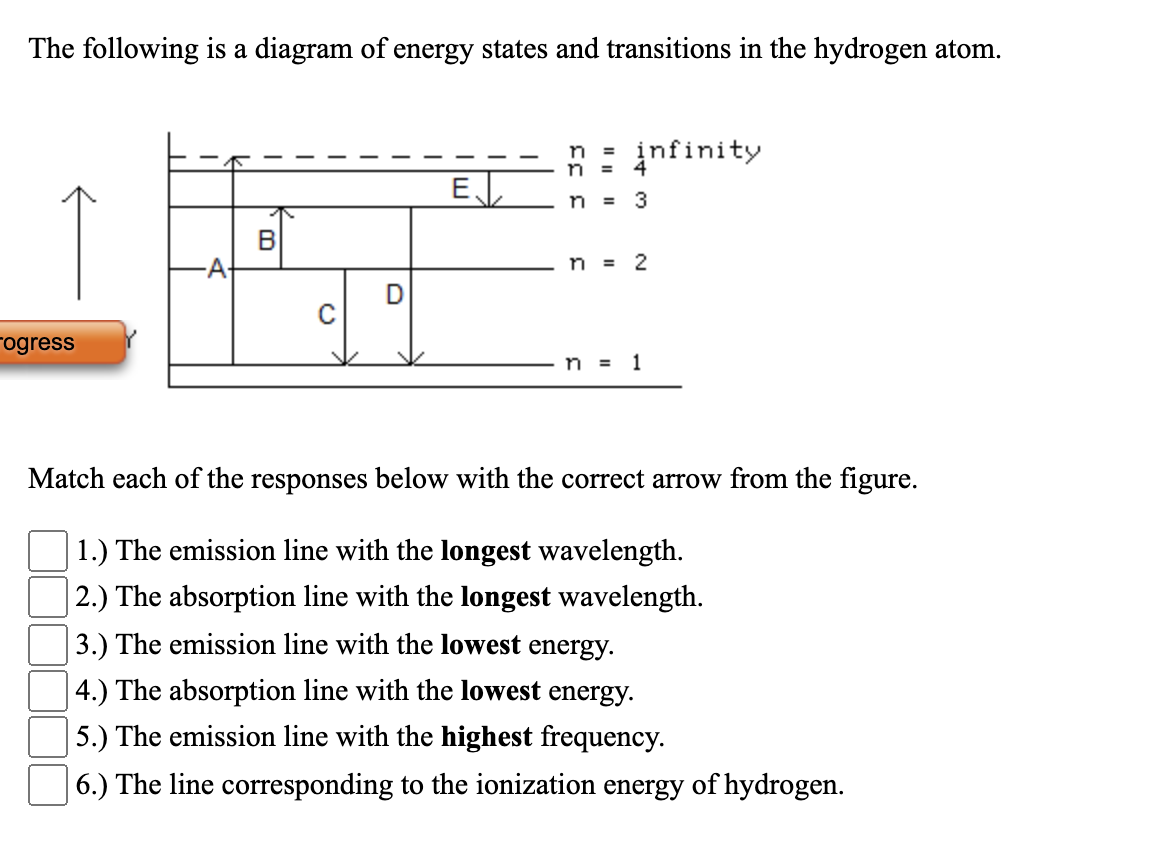 The followmg is a diagram of energy states and transitions in the hydrogen atom. n = n = Infinity EJ, n B A n = 2 D ENERGY n = 1 Match each of the responses below with the correct arrow from the figure. 4 1 5 1.) The emission line with the longest wavelength 2.) The absorption line with the shortest wavelength. 3.)