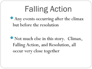 plot - plot - sequence of events in a literary sequence of events in a literary work.work. exposition --introduces the characters, background and setting rising action -adds complications leads to the climax falling action -the action that is a result of the climax resolution -tells or implies the outcome of the storyclimax-highest point of …