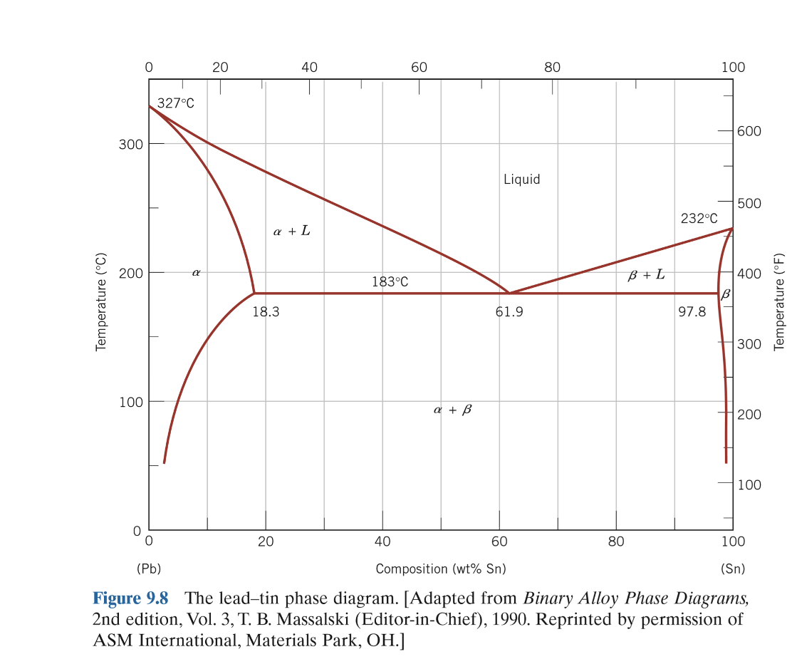 The binary Pb-Sn phase diagram has been studied for over 100 years and is a classic eutectic. Lead (Pb) has an atomic number of 82 and a high density. Its crystal structure is face-centered cubic (fcc). At 50 C, 2% Sn is soluble in Pb and at the eutectic temperature, 183 C, the maximum solubility of Sn in -Pb is 19%.