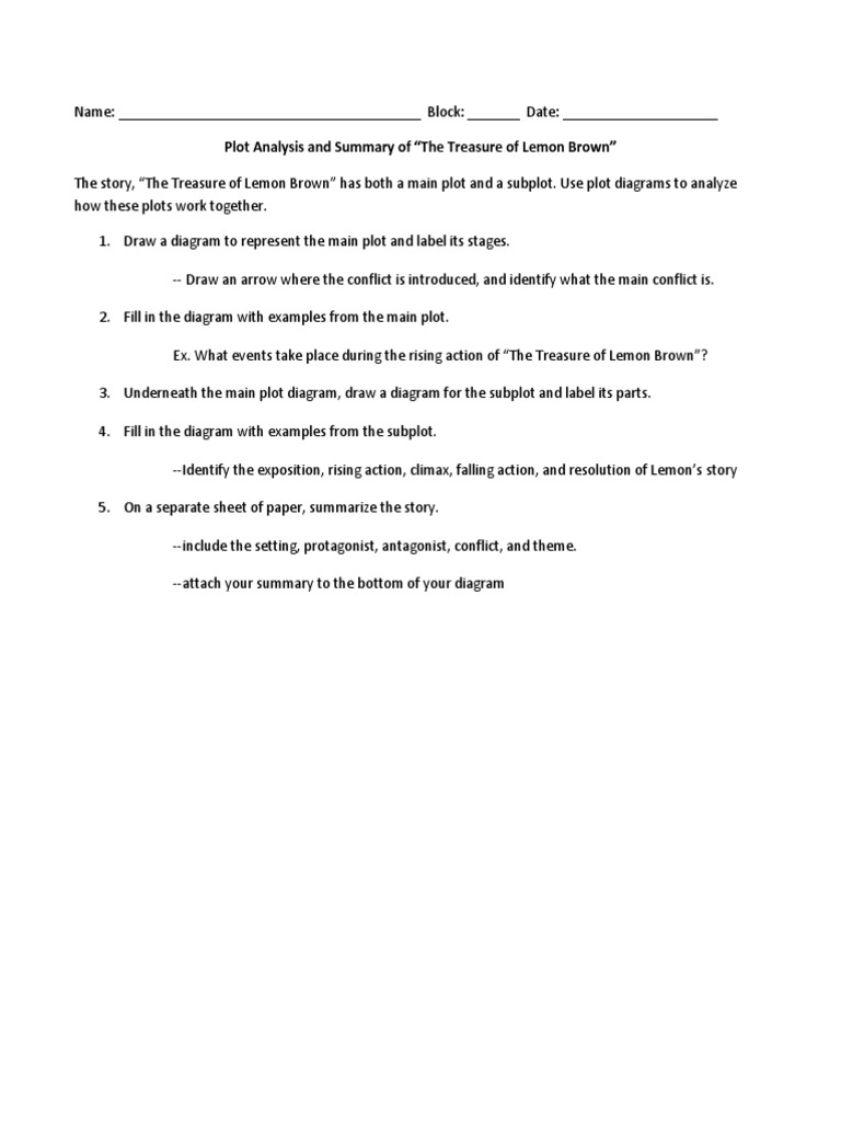 lemon plot diagram The story, The Treasure of Lemon Brown has both a main plot and a subplot. Use plot diagrams to analyze how these plots work together. 1. Draw a diagram to represent the main plot and label its stages. - - Draw an arrow where the conflict is introduced, and identify what the main conflict is.