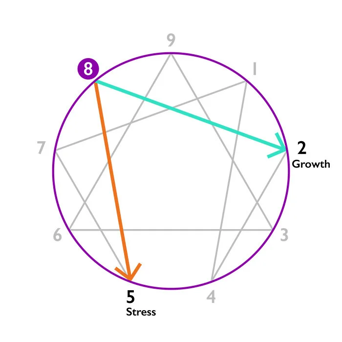 the Enneagram - Axis Arrows help describe how a specific type behaves when under stress (called “disintegration”) and when in comfort (called “integration”). In a nutshell, what this means is that when in comfort or psychological growth, a certain type will exhibit the behaviors of the type indicated by the green arrow in the diagram.