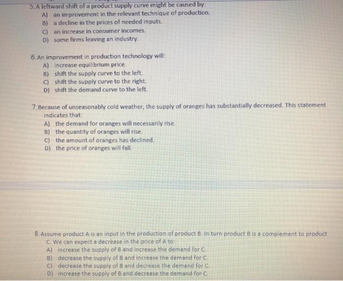Chpt 3 - Subjecto.com Refer to the above diagram. A decrease in supply is depicted by a: shift from S2 to S1. An effective price floor will. result in a product surplus. An increase in the price of product A will: increase the demand for substitute product B. An increase in the price of product A will: $8 and 60 units.