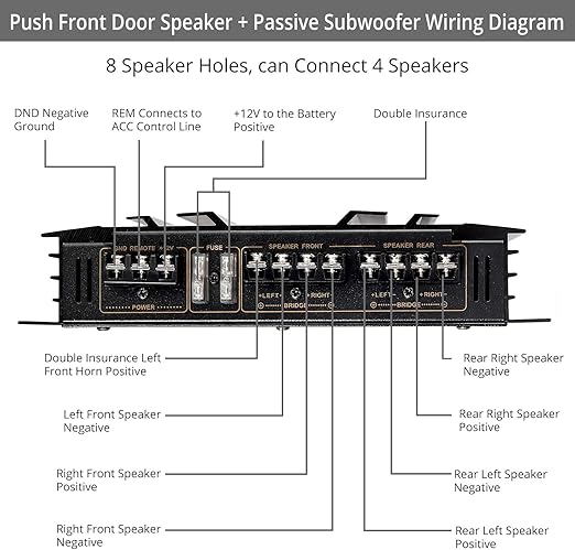 How To Hook Up A 4 Channel Amp To Front And Rear Speakers May 02, 2019 · An amp wiring kit like this one will make installing your 4 channel amp much easier. A good-quality one like this Belva 8-gauge complete kit includes not just wiring but much more. You’ll also need to pick up a 2nd pair of RCA cables (if using them) and enough speaker wire.