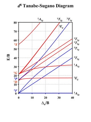 T sdiagram - slideshare.net T sdiagram. 1. d2 Tanabe-Sugano Diagram 1A 1E 1g g 80 3A 2g 70 60 1T 1g 1T 1S 2g 3T 50 1g E/B 40 3T 2g 1A 1g 30 1G 20 1E 3P g 1D 1T 2g 10 3F 3T 0 1g 0 10 20 30 40 ∆o/B.