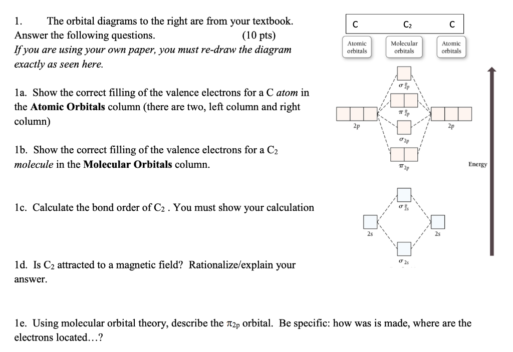 PDF MO Diagrams for Diatomic Molecules Summary MO Theory • LCAO-MO Theory is a simple method for predicting the approximate electronic structure of molecules. • Atomic orbitals must have the proper symmetry and energy to interact and form molecular orbitals. • Photoelectron spectroscopy provides useful information on the energies of atomic orbitals. • Next we'll see that symmetry will help us treat larger molecules in Solved Draw the molecular orbital diagrams for C2-, C2 ... Draw the molecular orbital diagrams for C2-, C2, and C2+. Which is the most stable molecule? Which molecule (s) is/are paramagnetic? Who are the experts? Experts are tested by Chegg as specialists in their subject area. We review their content and use your feedback to keep the quality high.