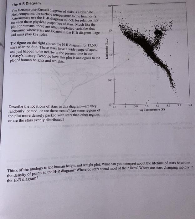 1. true or false? a hertzsprung-russell (h-r) diagram is a ... a hertzsprung-russell (h-r) diagram is a convenient way to see the relationship between the luminosity and the brightness of stars. 2. convert the following temperatures. A hertzsprung-russell diagram shows the relationship ... The Hertzsprung-Russell diagram shows the relationship between what two factors? A Hertzsprung-Russell diagram shows the relationship between the absolute magnitude and temperature of stars. Introduction to the Hertzsprung-Russell Diagram The Hertzsprung-Russell Diagram Graphing or plotting data is an essential tool used by scientists. In attempting to make sense of data and see if two quantities are related we can plot them and seek trends. If we have a look at the two examples below the first shows two quantities, X and Y that an object may have. Key concepts(25.1) Flashcards - Quizlet The H-R diagram shows the relationship between what two factors? A Hertzsprung-Russell diagram shows the relationship between the absolute magnitude and temperature of stars. OTHER SETS BY THIS CREATOR. Chp.22 vocab 12 Terms. Jane7182002. Ch.15 +16 terms 11 Terms. Jane7182002.